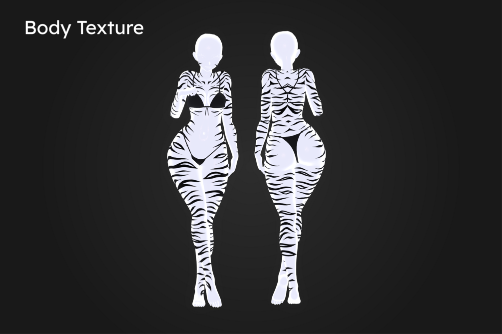 - 4 premade fur textures (made from CicieaaaVR’s FREE Hair Texture as base + my tiger stripe edits)